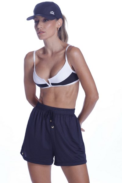 A união entre o preto e o branco — clássico dos clássicos — ganha destaque com o viés branco contornando as peças, criando um visual elegante, moderno e cheio de atitude.
